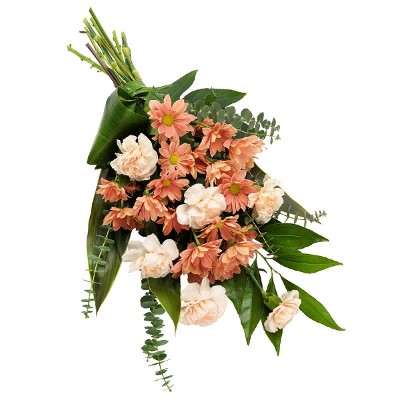 Begravelsesbuket i varme farver med blomster såsom nelliker og krysantemum sammen med sæsonens grønne. En smuk kreation, der passer perfekt, når du vil ære en, der er gået bort. Begravelsesbuketten er et eksklusivt floristhåndværk, og blomsterne er nøje udvalgt for at sikre høj kvalitet. Hver buket er unik og bindes efter sortiment og sæson – men bevarer altid sin farve og form. Buketten leveres af en lokal florist direkte til begravelsesceremonien.