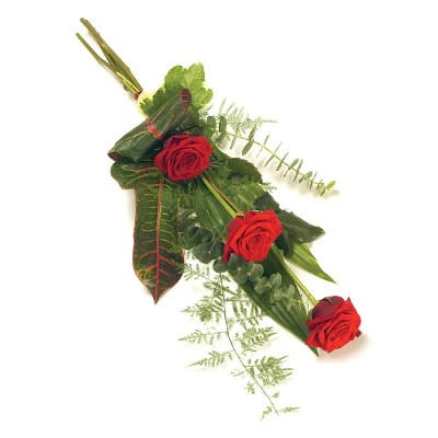 Begravelsesbuket med røde roser, eucalyptus, aspargesbregne samt dekorative blade som croton og aspidistra. Sammen med sæsonens grønt er denne sørgebuket et smukt og stilfuldt valg, når du ønsker at ære en kær, der er gået bort. Tilføj gerne et elegant silkebånd med en personlig hilsen. Begravelsesbuketten er et eksklusivt floristhåndværk, og blomsterne er nøje udvalgt for at sikre høj kvalitet. Hver buket er unik og bindes ud fra sortiment og sæson – men bevarer altid sit udtryk og form. Arrangementet leveres af en lokal florist direkte til begravelsesceremonien.